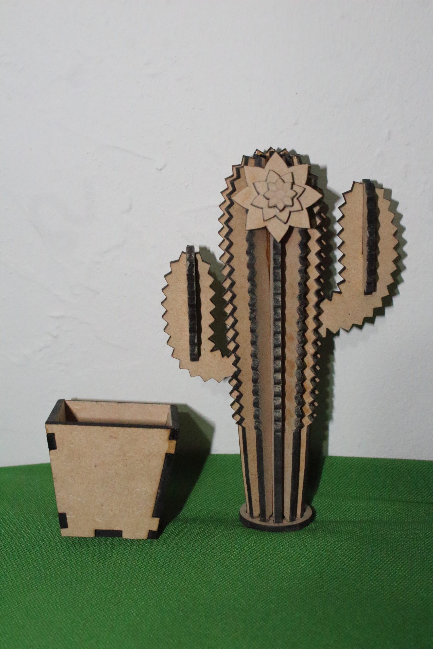 Cactus de madera con una flor, varios modelos. Incluye maceta de mismo material.